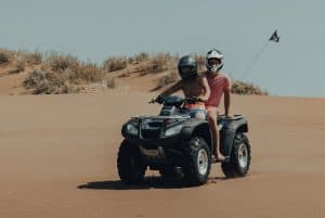 Men Riding Black and Gray ATV on Brown Sand